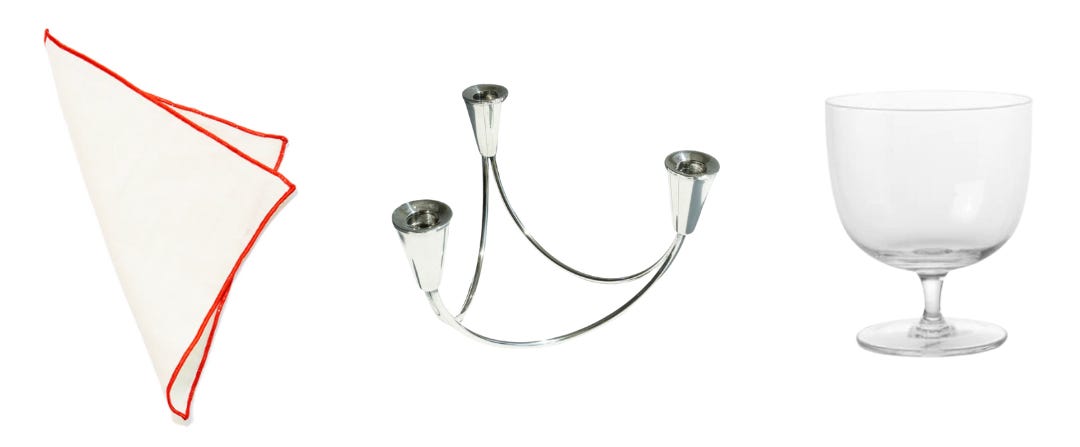Anything Ariane touches has to feel elegant, expensive, but unfussy. She doesn’t want to come off like she’s trying too hard. I added just a hint of red with these lovely napkins from Madre Linen, a candelabra that feels like an art piece, and pretty host glasses for water or wine from Ferm Living.